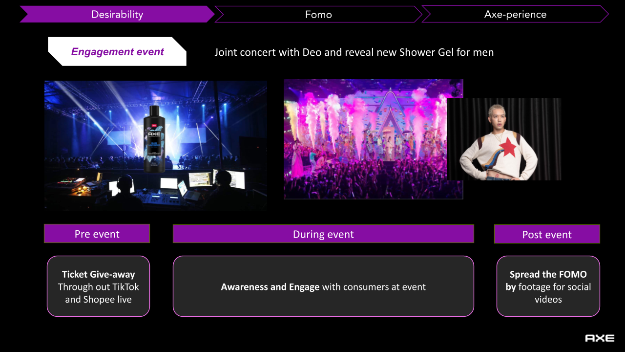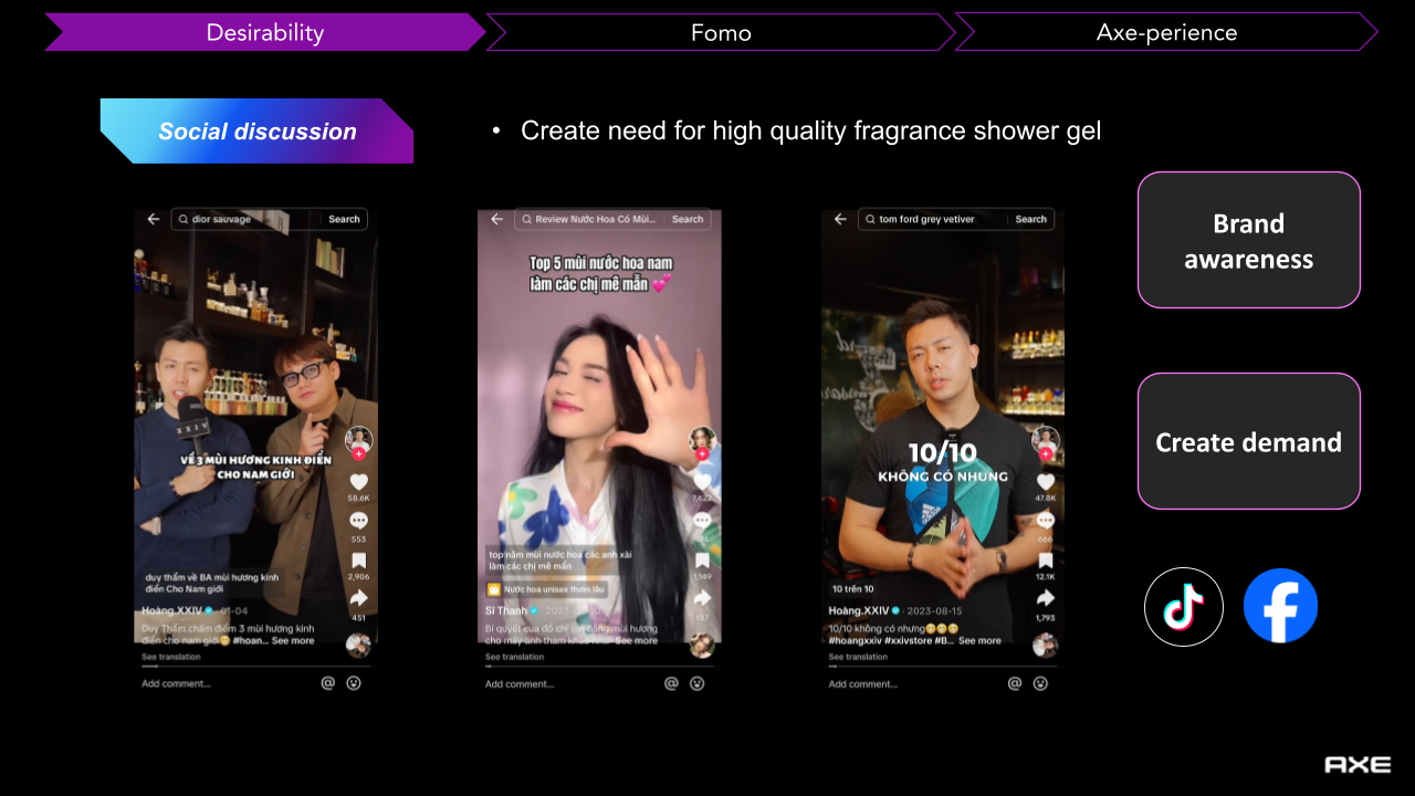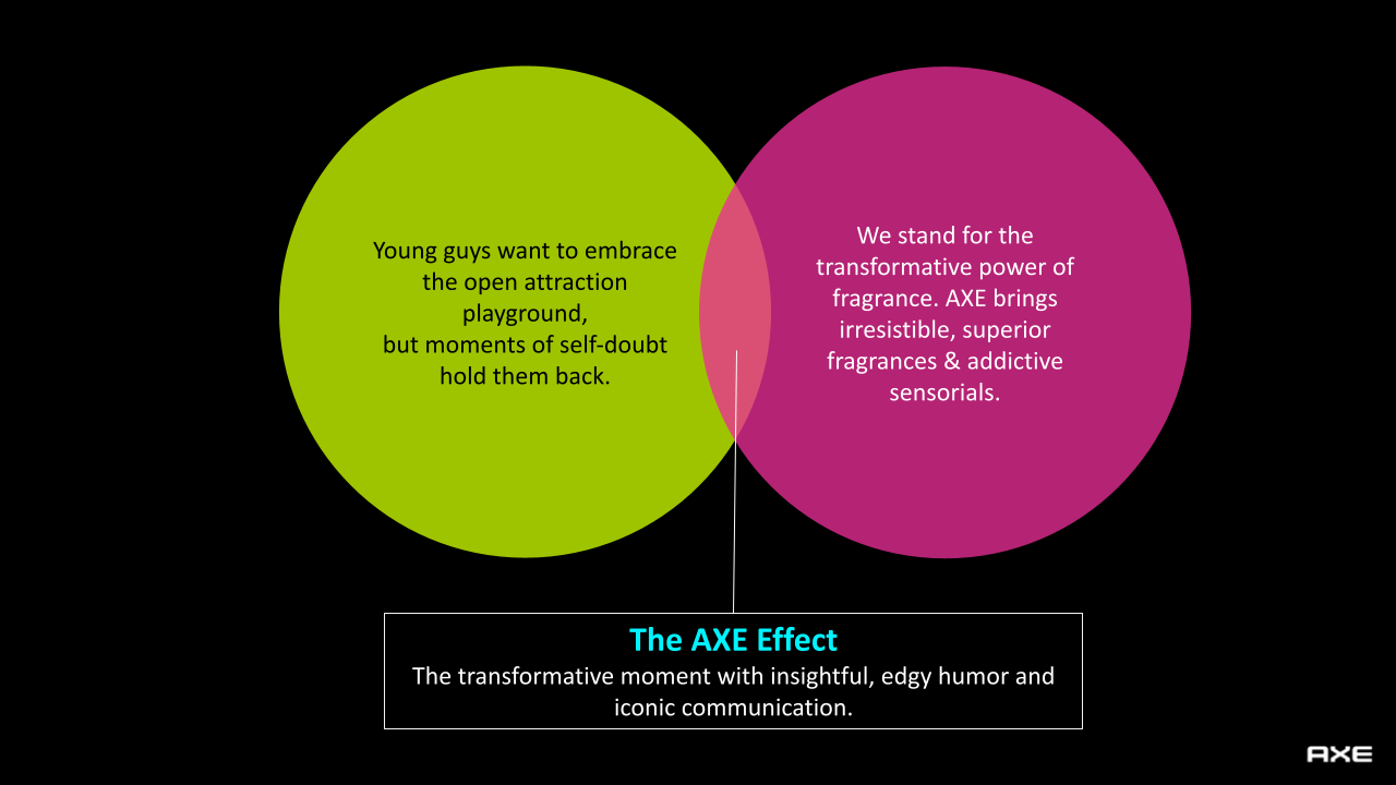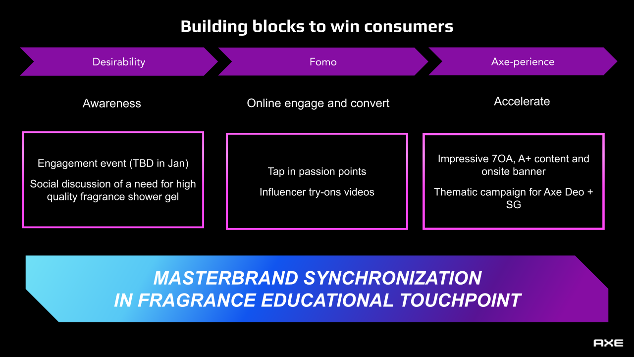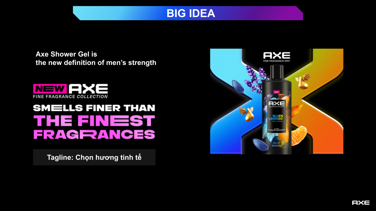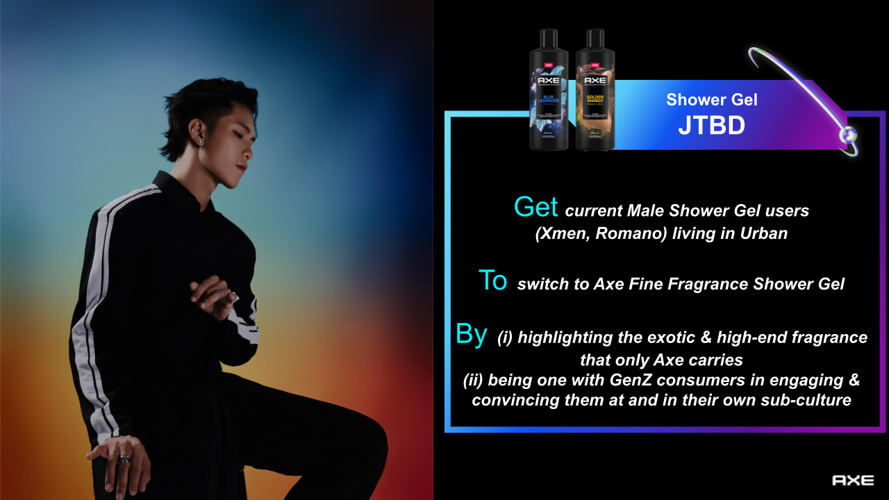 Objective: - Build awareness as the go-to fragrance brand in men’s shower gel. - Drive trial and new customer acquisition. - Establish AXE as a fragrance leader in men’s grooming.