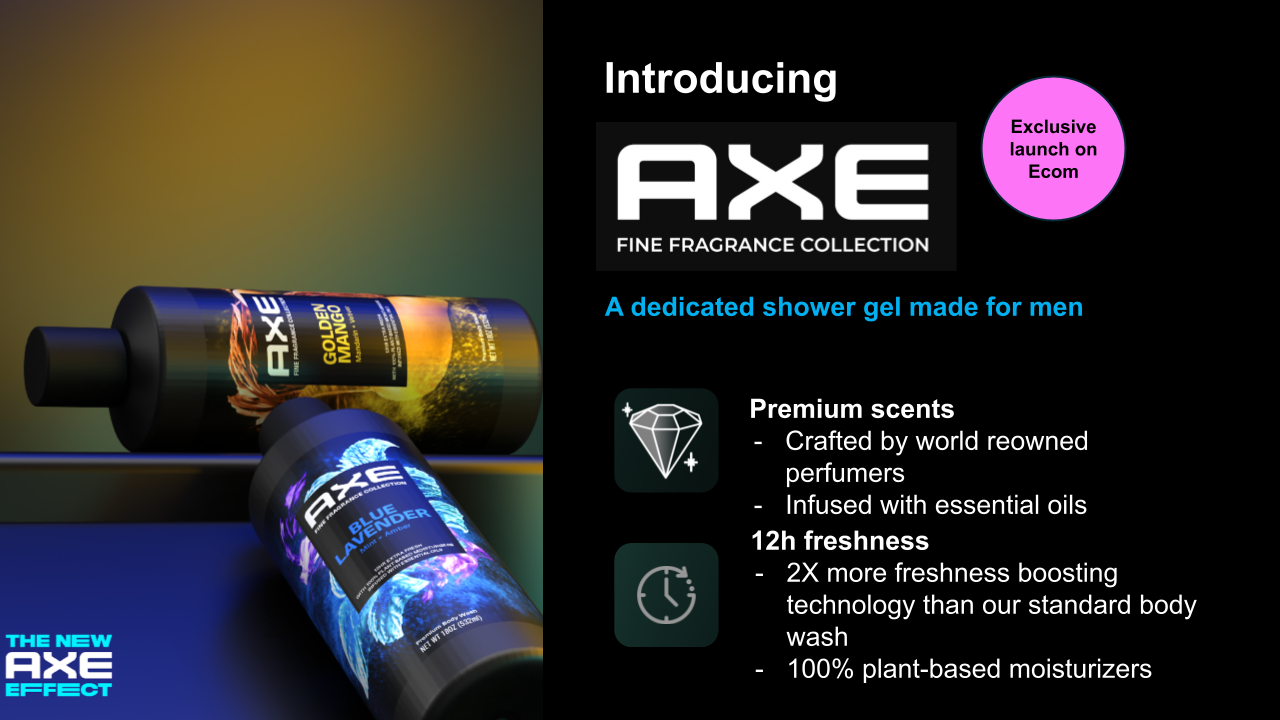 Brand Situation: - AXE enters with fragrance-first shower gel, launching 2 variants: Blue Lavender & Golden Mango. - Positioned as high-quality fragrance at an accessible price.